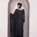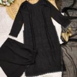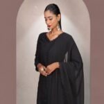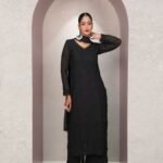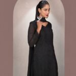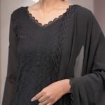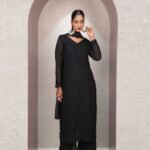 Make a bold style statement with this stunning black georgette long suit set featuring delicate chikankari embroidery and a sophisticated side-cut kurta design. Made from premium fox georgette fabric with soft inner lining, this outfit combines comfort with elegance. The matching embroidered georgette dupatta with lace detailing completes the ensemble, making it perfect for evening occasions.