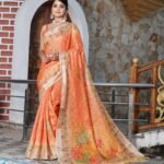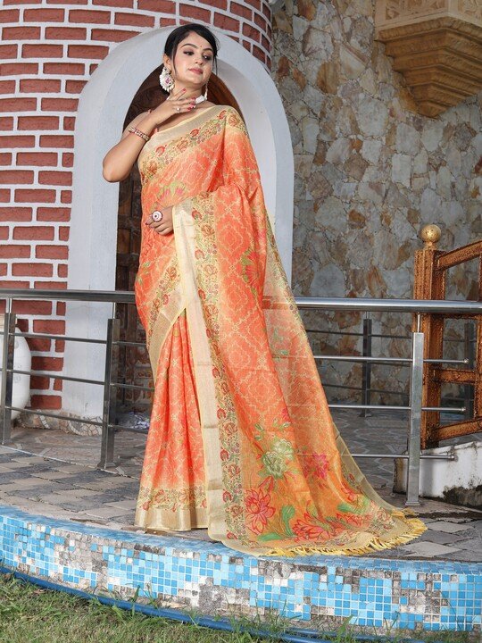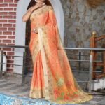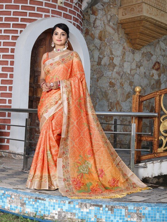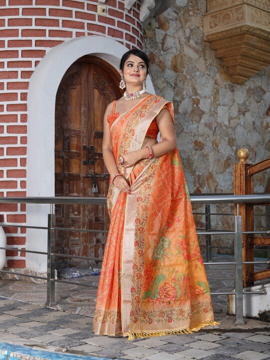 Radiate festive charm in this fancy orange tissue cotton saree, enriched with zari shimmer work and stunning digital print motifs. Lightweight yet luxurious, this saree is designed for effortless draping and a glamorous party look. Perfect for weddings, receptions, and traditional celebrations.