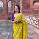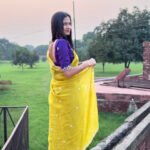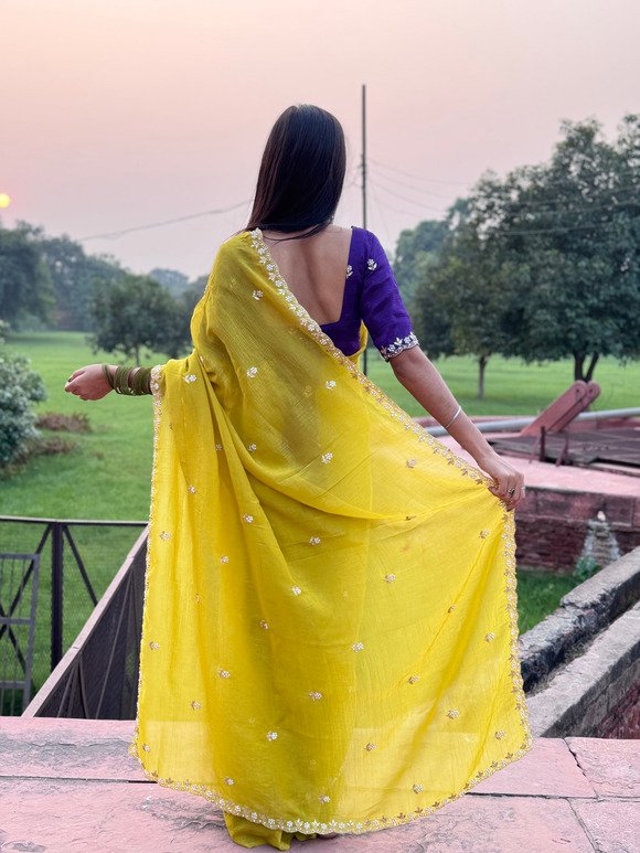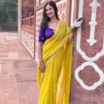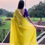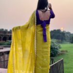 🎨 Color: Vibrant mustard-yellow saree with contrasting purple blouse