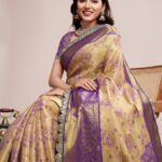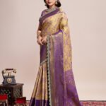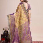 💜 Elegant gold and purple dual-tone body with all-over zari weave.