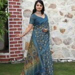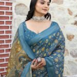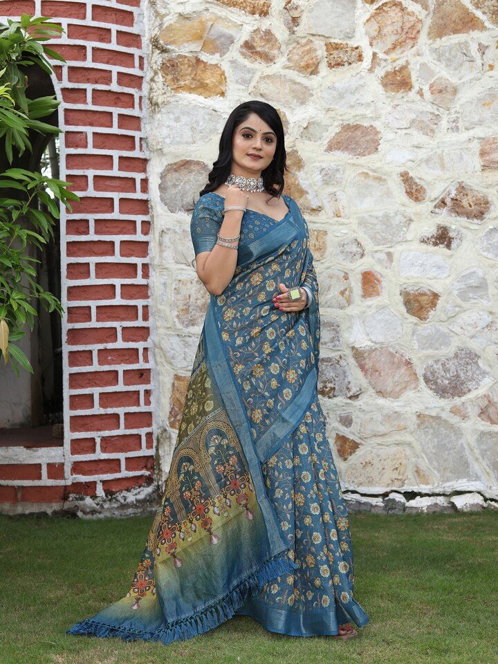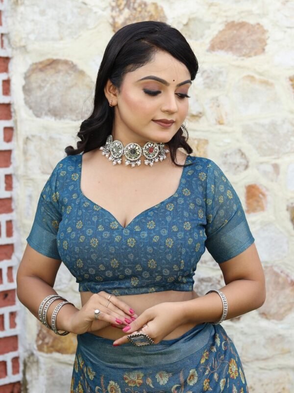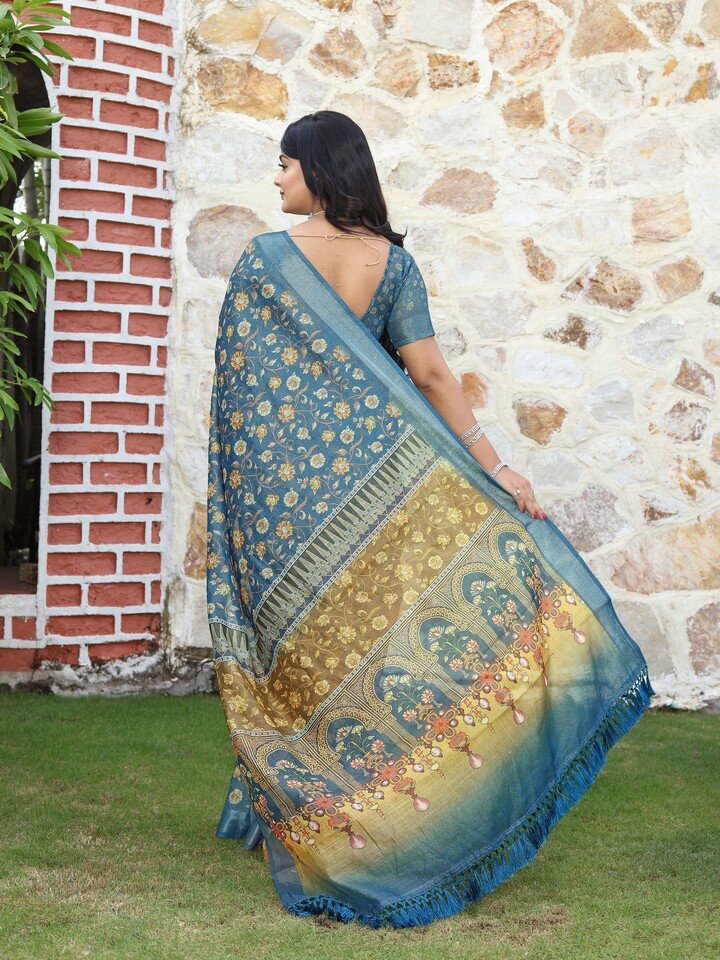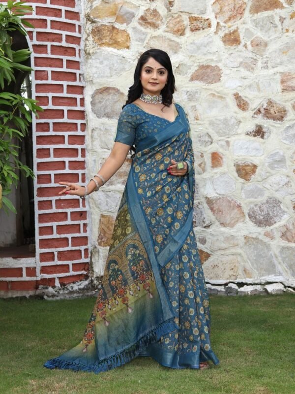 Crafted from premium Tissue Cotton fabric, it offers a lightweight, breathable, and comfortable drape. The ornate pallu with digital print and tassel detailing (zalar) adds a graceful touch, while the matching digital print blouse piece completes the look.
