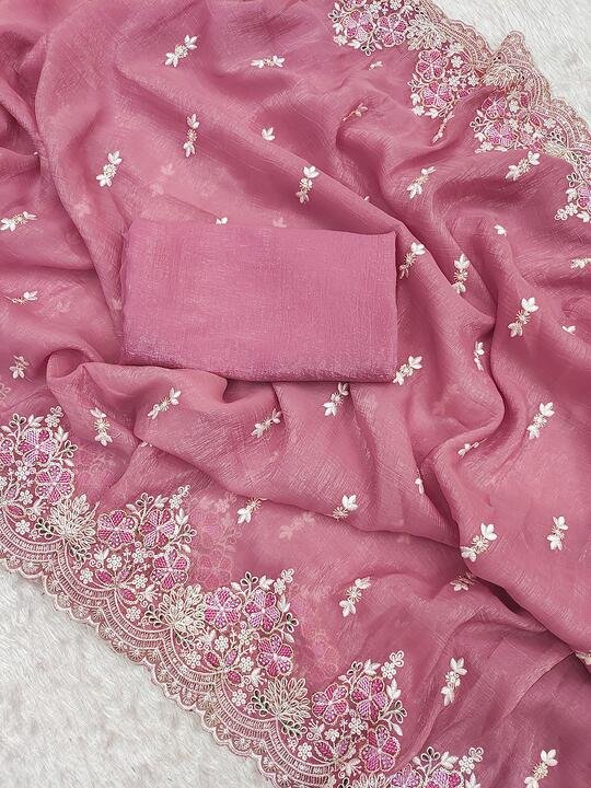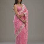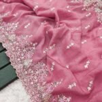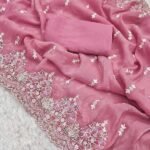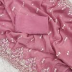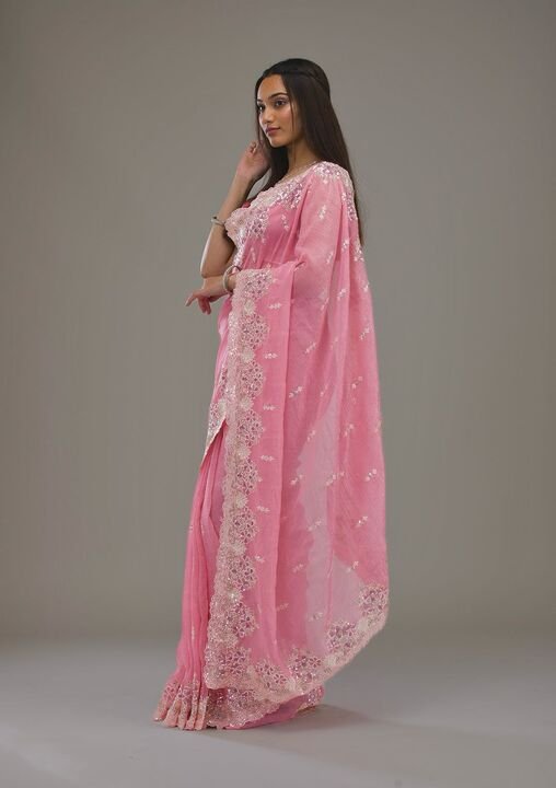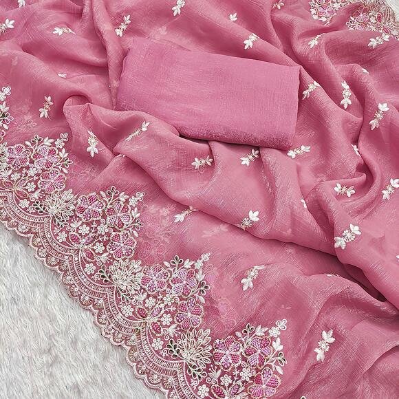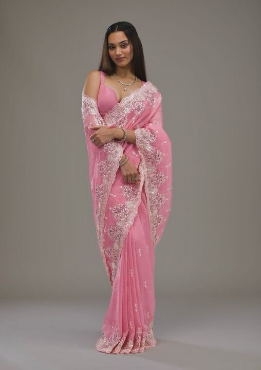 Step into pure elegance with this Premium Crunchy Fabric Saree in a soft pastel pink hue, beautifully adorned with heavy embroidery threadwork and sequins. The exquisite craftsmanship and delicate fancy cutwork border make it a perfect ensemble for weddings, receptions, and festive occasions.