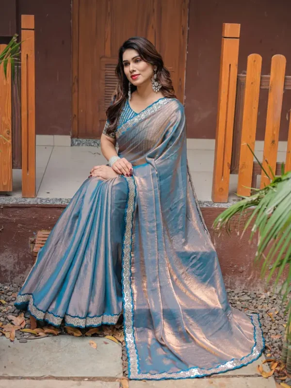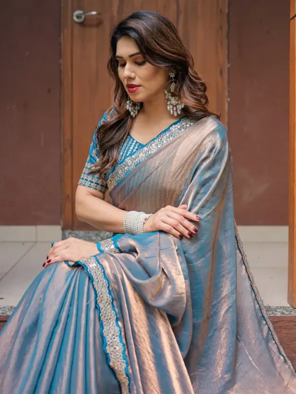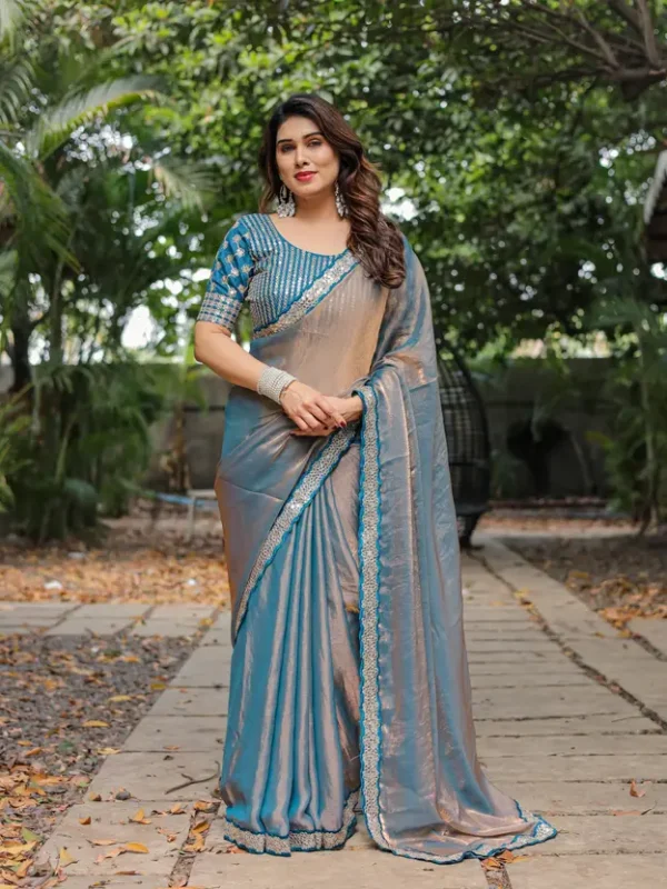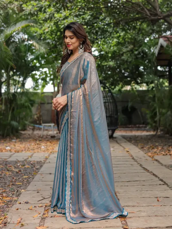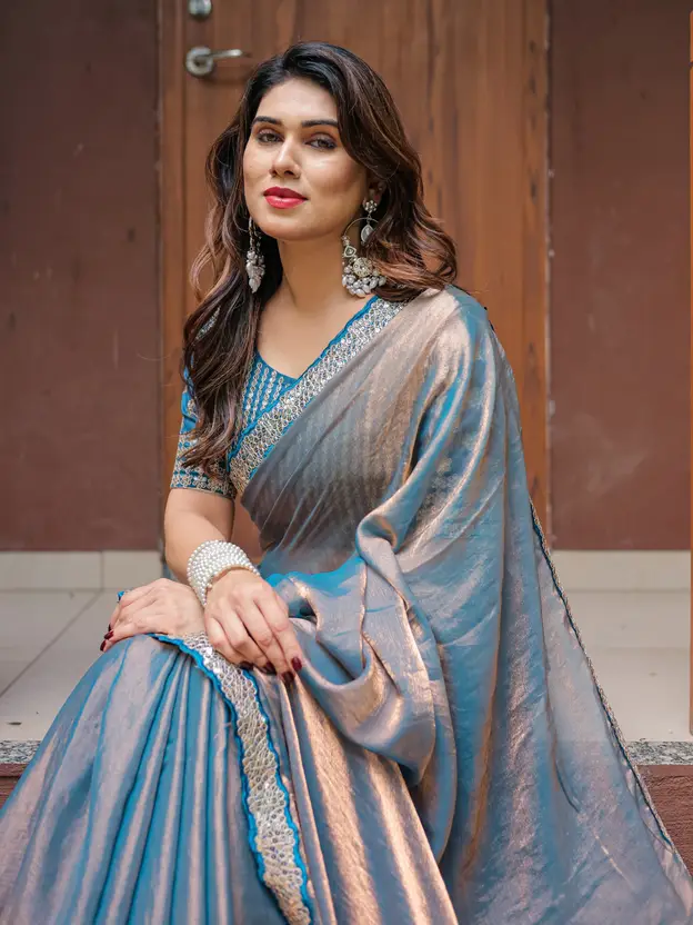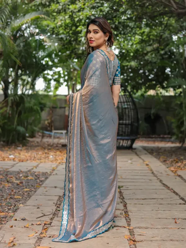 Drape yourself in understated glamour with this captivating saree, crafted from a luxurious soft faux chiffon fabric that offers a graceful and fluid drape. This unique piece features a mesmerizing dual-tone effect, subtly shifting between hues like dusty blue/teal and soft rose gold/bronze as the fabric moves, creating a sophisticated play of light.