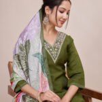 Intricate Embroidery: The A-line Kurta features rich Embroidered detail, beautifully placed on the Front Panel and V-Neckline, adding a touch of sophistication against the deep Green hue.