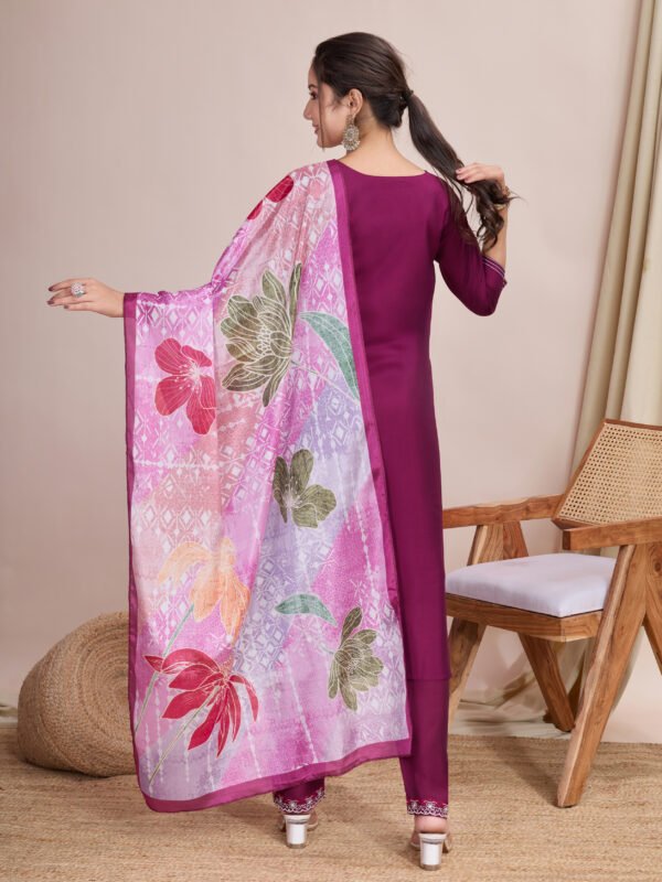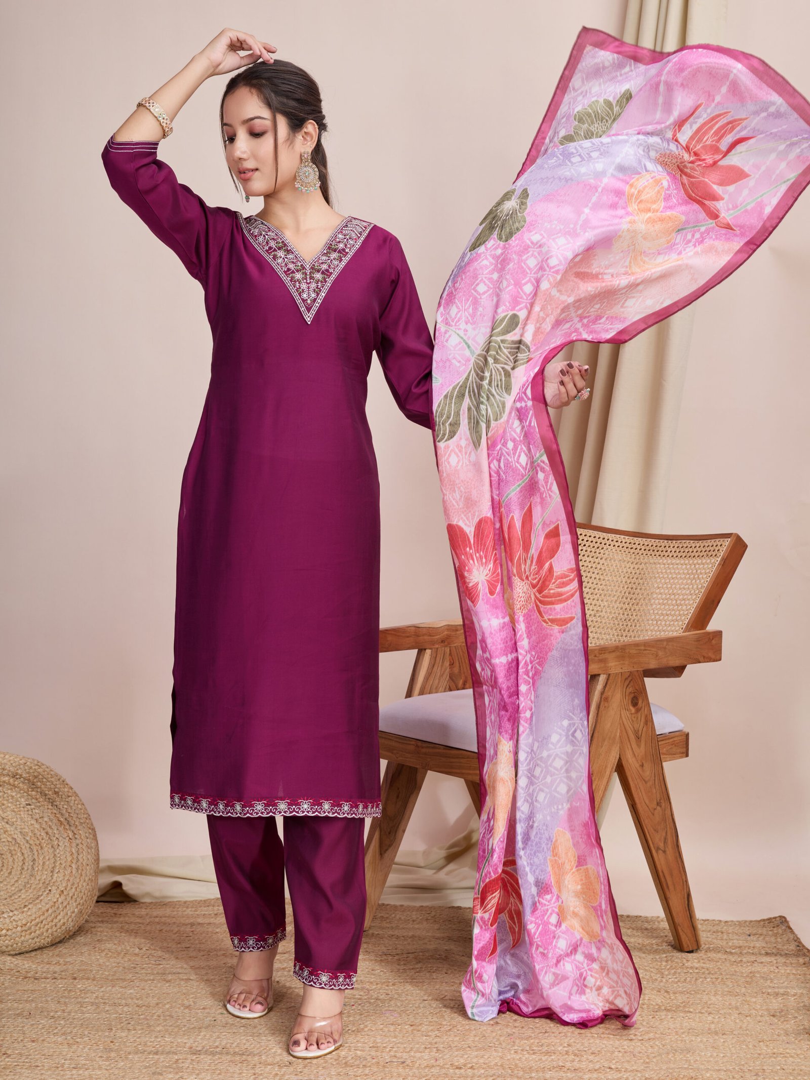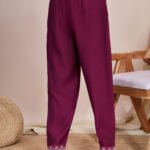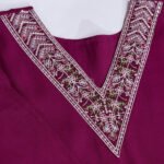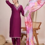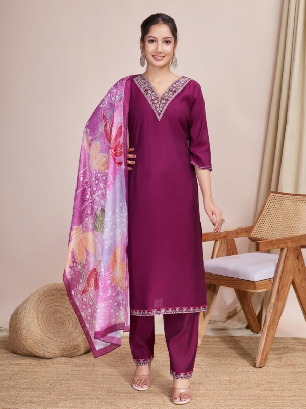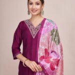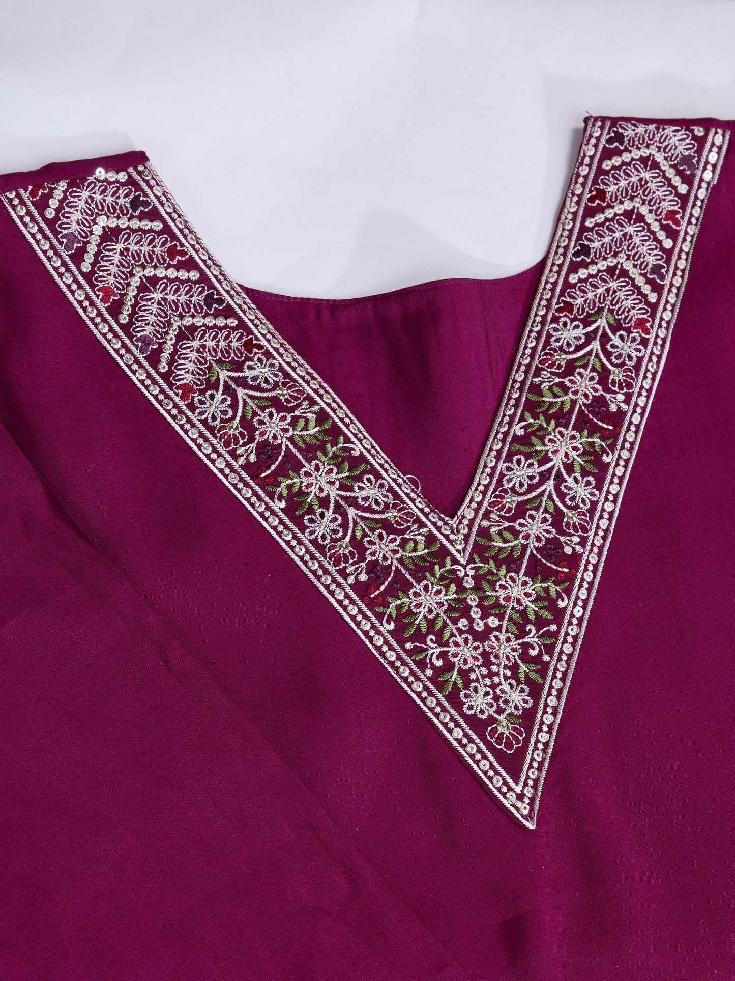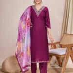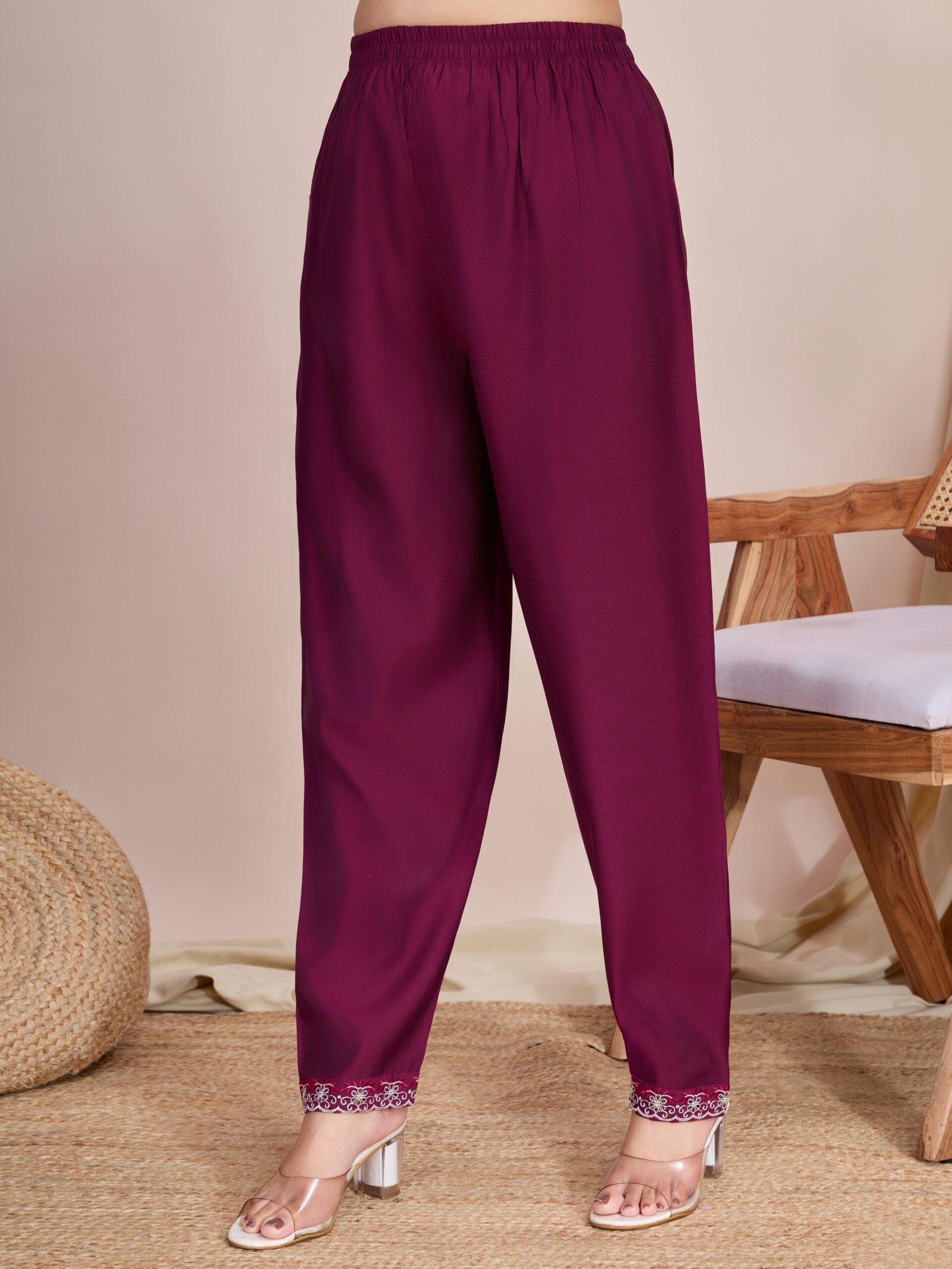Intricate Embroidery: The A-line Kurta features rich Embroidered detail, beautifully placed on the Front Panel and V-Neckline, adding a touch of sophistication against the deep Purple hue.