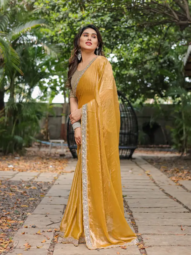 Illuminate any occasion with this breathtaking radiant golden saree, crafted from a luxurious soft faux chiffon fabric that drapes with exquisite grace. The warm, luminous golden hue exudes sophistication and festive cheer, making it a perfect choice for celebratory events.