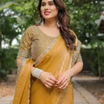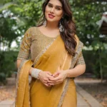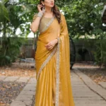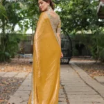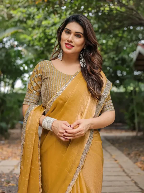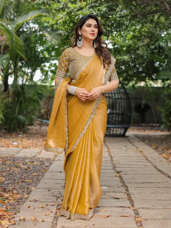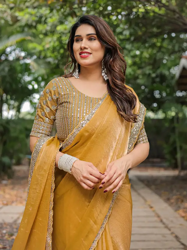 This exquisite golden saree is an impeccable choice for weddings, grand festivities, evening gatherings, or any special event where you wish to embody grace, luxury, and captivating brilliance.