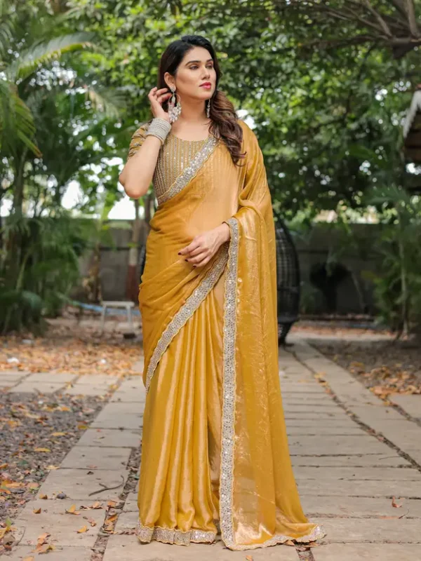 Radiant Golden Faux Chiffon Saree with Sequin Work Lace Border and Embroidered Blouse