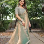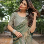 Complementing the saree is a striking embroidered blouse. The blouse showcases meticulous embroidery, likely in tones that harmonize with the saree’s border and overall dual-tone effect, adding rich texture and a refined finish. Its design ensures a perfect pairing, elevating the entire ensemble to a new level of grandeur.