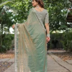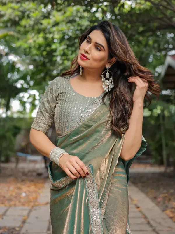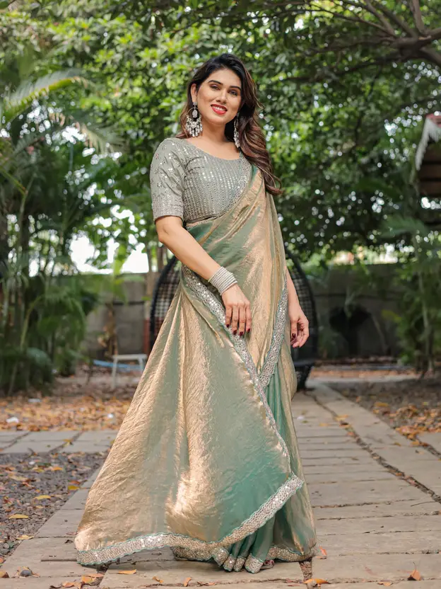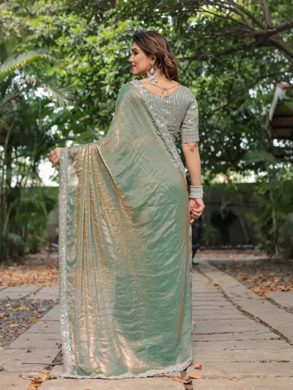 Step into an aura of refined elegance with this captivating saree, crafted from a luxurious soft faux chiffon fabric that offers a gracefully fluid drape. This unique piece features a mesmerizing dual-tone effect, subtly shifting between hues like serene teal/sea green and soft golden/bronze as the fabric moves, creating a sophisticated play of light and shadow.