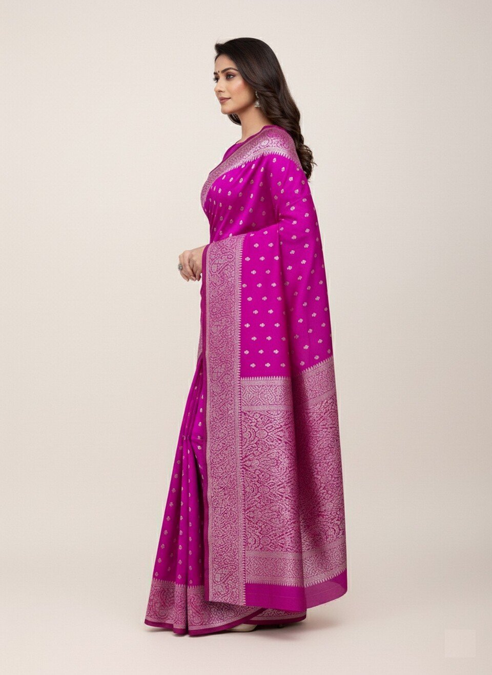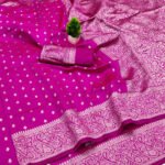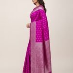 Elegant Look – The pink base paired with silver zari-style weaving adds sophistication and festive charm.